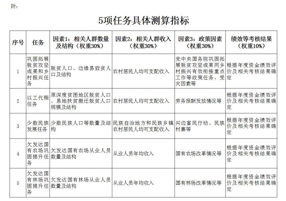 第二條 銜接資金按照鞏固拓展脫貧攻堅成果和鄉(xiāng)村振興、以工代賑、少數(shù)民族發(fā)展、欠發(fā)達國有農(nóng)場鞏固提升、欠發(fā)達國有林場鞏固提升、“三西”農(nóng)業(yè)建設任務進行分配。資金分配按照因素法進行測算,因素和權重為:相關人群數(shù)量及結構30%、相關人群收入30%、政策因素30%、績效等考核結果10%,并進行綜合平衡。各項任務按照上述因素分別確定具體測算指標(詳見附件)?!叭鳌鞭r(nóng)業(yè)建設任務按照國務院批準的規(guī)模安排。