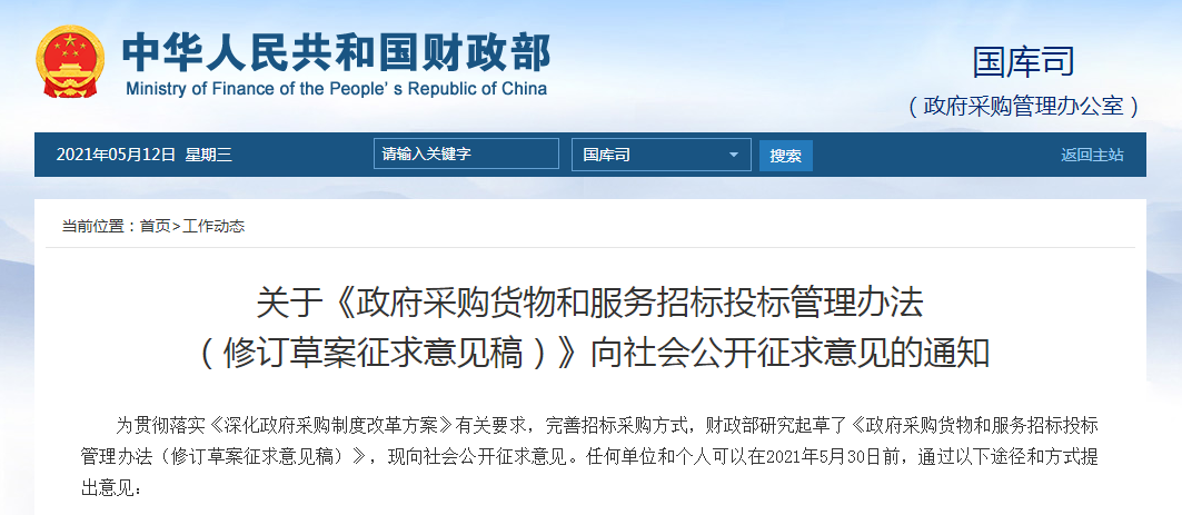 為貫徹落實(shí)《深化政府采購(gòu)制度改革方案》有關(guān)要求,完善招標(biāo)采購(gòu)方式,財(cái)政部研究起草了《政府采購(gòu)貨物和服務(wù)招標(biāo)投標(biāo)管理辦法(修訂草案征求意見(jiàn)稿)》,現(xiàn)向社會(huì)公開(kāi)征求意見(jiàn)。任何單位和個(gè)人可以在2021年5月30日前,通過(guò)以下途徑和方式提出意見(jiàn):