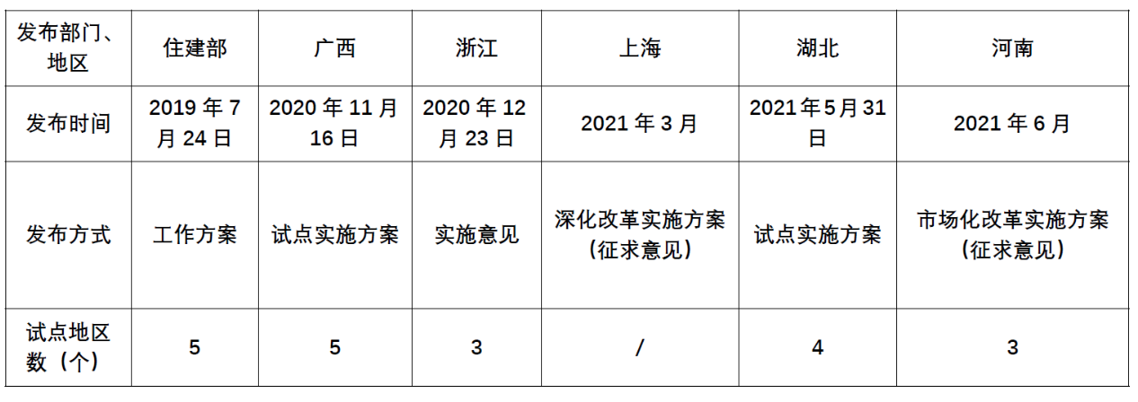 2020年7月24日,住房和城鄉(xiāng)建部辦公廳印發(fā)關(guān)于工程造價(jià)改革工作方案的通知(建辦標(biāo)〔2020〕38號,以下簡稱38號文),通知決定在北京市、浙江省、湖北省、廣東省、廣西壯族自治區(qū)等五個(gè)地區(qū)開展方案試點(diǎn)工作。截至本稿起筆日(2021.6.3),廣西、浙江和湖北等三個(gè)試點(diǎn)地區(qū)相繼發(fā)布有關(guān)方案通知,北京、廣東尚未見官方相關(guān)信息。五個(gè)試點(diǎn)城市外,上海、河南等地的方案在征求意見中。