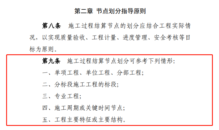 《暫行辦法》分為總則、節(jié)點(diǎn)劃分指導(dǎo)原則、招投標(biāo)與合同約定、結(jié)算與支付、監(jiān)督管理、附則等六個(gè)章節(jié),共二十六個(gè)條文,具體如下