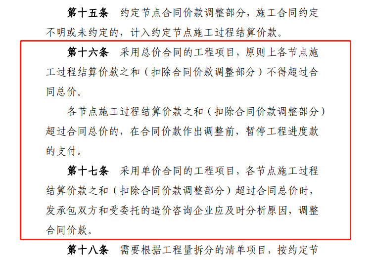 分別對總價(jià)合同的建設(shè)項(xiàng)目和單價(jià)合同的建設(shè)項(xiàng)目的施工過程結(jié)算的方式和過程進(jìn)行解釋、說明??偠灾?,不管總價(jià)合同還是單價(jià)合同,施工過程結(jié)算價(jià)款之和(扣除合同價(jià)款調(diào)整部分)均不得超過合同總價(jià),否則可能出現(xiàn)工程未完成已支付完成的情況。具體支付比例可根據(jù)發(fā)包人資金使用計(jì)劃在合同中約定,但不得低于當(dāng)?shù)匦姓鞴懿块T的相關(guān)規(guī)定。