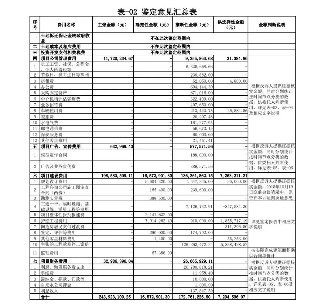 由于本項(xiàng)目涉及費(fèi)用項(xiàng)目、金額均較大,《鑒定意見(jiàn)書(shū)》中分別根據(jù)證據(jù)情況、國(guó)家文件規(guī)定、解除合同時(shí)間等分類(lèi)方式,逐項(xiàng)對(duì)金額進(jìn)行了分類(lèi),并附加相關(guān)說(shuō)明,為法庭判決提供了數(shù)據(jù)支撐。最終鑒定確定性金額16,572,901.30元,推斷性金額172,761,226.50 元,供選擇性金額7,294,596.07 元,具體詳表-02