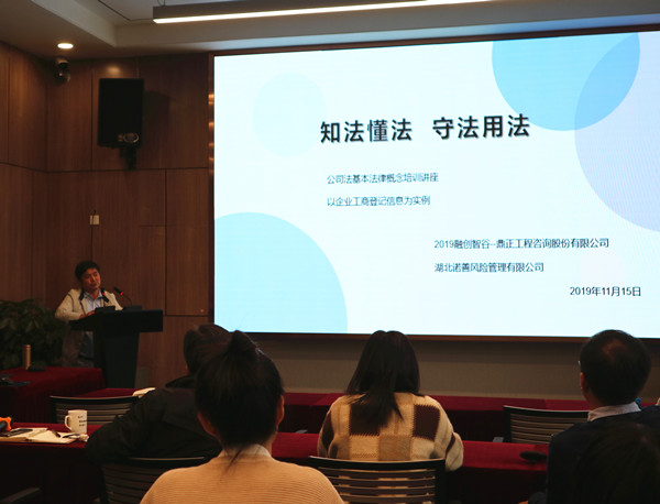 11月15日下午,我司組織開展了2019 年公司法概論與風險防控知識培訓。本次培訓邀請湖北諾善風險管理有限公司王振宇律師、馮美淵律師就《公司法》實務知識進行講解,公司董事長王雁然、副總經理毛迎霞、技術總監(jiān)朱立冬、副總經理姚建功等領導及各部門中層管理人員、企業(yè)發(fā)展中心、行政中心全體成員參加了本次培訓,各分公司同事遠程同步參與學習。