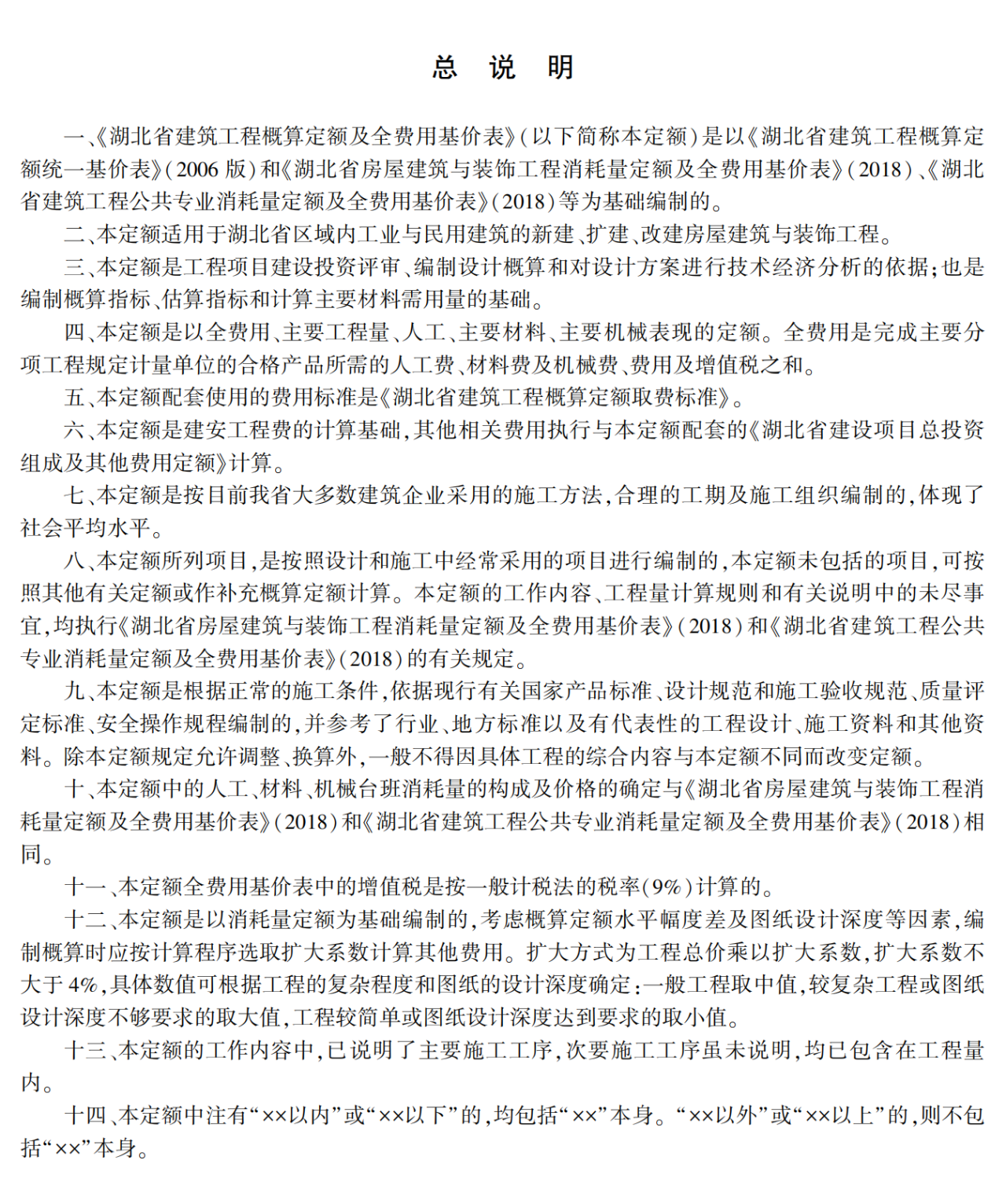 為進(jìn)一步完善我省計價依據(jù)體系,滿足工程項目投資估算、設(shè)計概算的編制需要,根據(jù)國家有關(guān)規(guī)范、標(biāo)準(zhǔn),結(jié)合我省實際,我廳組織編制了《湖北省建設(shè)工程概算定額及全費用基價表》《湖北省建設(shè)項目總投資組成及其他費用定額》(以下簡稱“本定額”),經(jīng)審定通過,現(xiàn)予發(fā)布,并就有關(guān)事項通知如下: