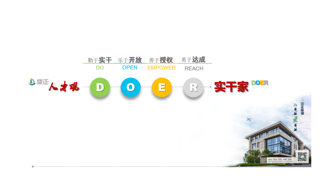 鼎正“DOER實干家”人才觀,是我們對人才認知的基本價值觀,亦是人才發(fā)展成長的路徑,它能具體化指導同事們在工作中“對于自己、對于他人、對于團隊、對于上級”分別能做些什么、該如何去做,從而調(diào)動和培養(yǎng)同事們發(fā)展的內(nèi)驅(qū)力和工作的協(xié)同性。