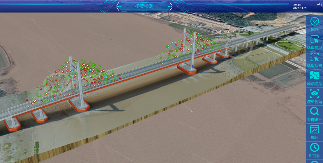 根據(jù)拍攝的高清圖像重建橋梁三維模型,并定量標(biāo)示各類缺陷的位置,并且搭建獨(dú)立的大數(shù)據(jù)云平臺,實(shí)現(xiàn)橋梁缺陷與病害的可視化,對橋梁問題進(jìn)行三維立體化復(fù)現(xiàn),為橋梁安全運(yùn)行提供數(shù)據(jù)支撐。