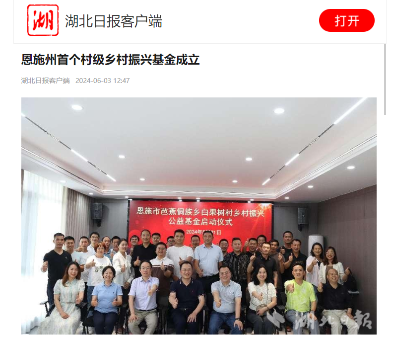 5月31日下午,恩施市芭蕉侗族鄉(xiāng)白果樹村鄉(xiāng)村振興公益基金在白果樹村正式啟動,這是恩施州首個村級鄉(xiāng)村振興基金,也是白果樹村加快推進(jìn)鄉(xiāng)村振興的最新創(chuàng)舉。