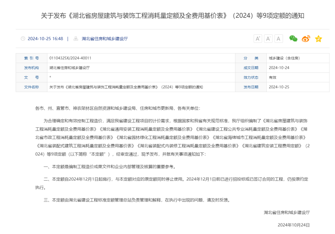▲《湖北省房屋建筑與裝飾工程消耗量定額及全費用基價表》(2024)等9項定額正式發(fā)布