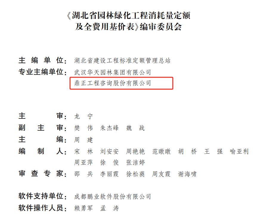 鼎正作為《湖北省園林綠化工程消耗量定額及全費用基價表》《湖北省建筑安裝工程費用定額》的參編單位之一,充分發(fā)揮全過程工程咨詢資源集中的優(yōu)勢,為此次定額的修訂貢獻了鼎正在全過程工程咨詢、工程造價咨詢業(yè)務領(lǐng)域編審設計概算、投資估算、工程預算、過程結(jié)算、竣工結(jié)算等實踐經(jīng)驗,對進一步完善工程造價計價依據(jù)體系提供了有力的技術(shù)支撐。