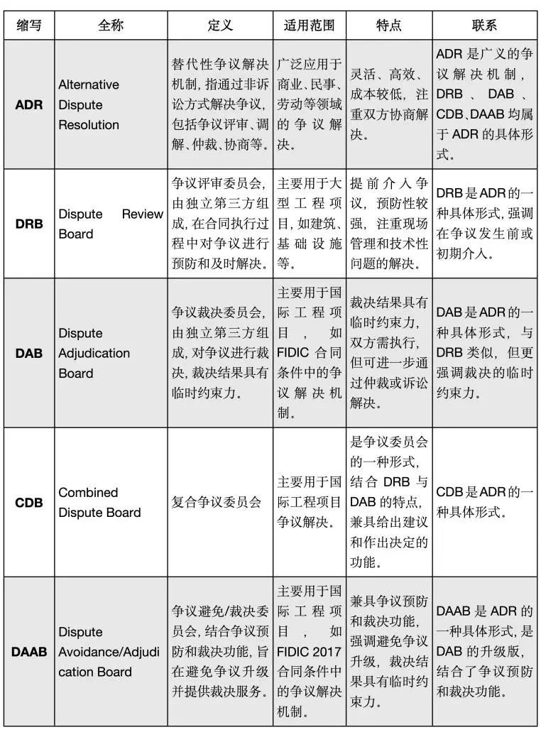 《替代性爭議解決機(jī)制(ADR)中爭議評審/裁決機(jī)制(DRB/DAB)的由來及演進(jìn)》一文已經(jīng)詳細(xì)介紹了ADR(Alternative Dispute Resolution)替代性爭議解決機(jī)制的概念及起源,以及在這種爭議解決方式下DRB/DAB(Dispute Review Board/Adjudication Board)爭議評審/裁決機(jī)制的演進(jìn)。筆者將與之相近的幾個概念也做一對比:
