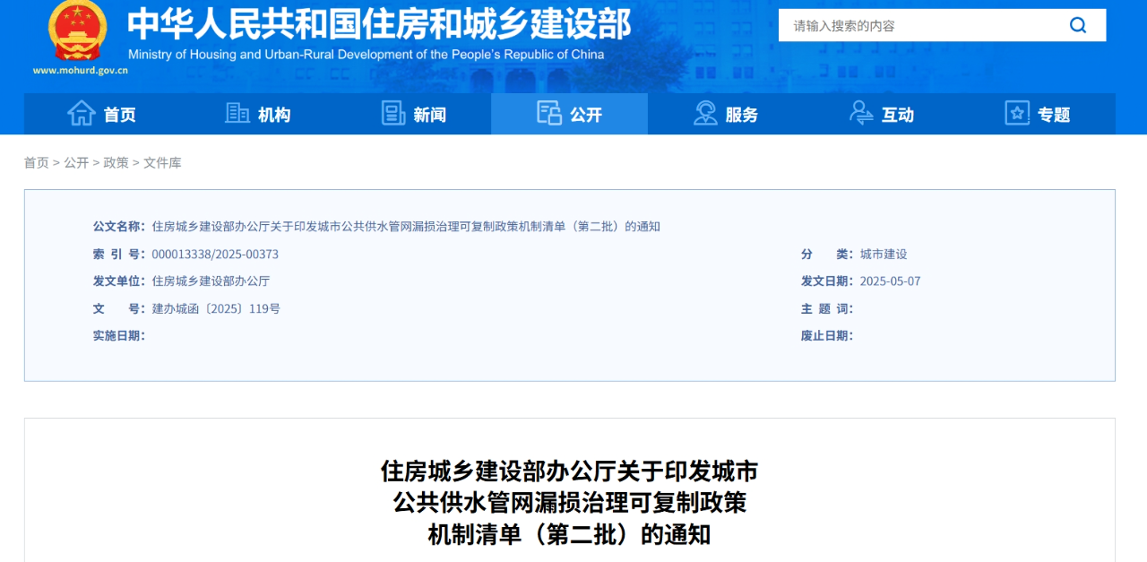 為加強(qiáng)城市公共供水管網(wǎng)漏損治理,健全長效機(jī)制,近日,住房城鄉(xiāng)建設(shè)部、國家發(fā)展改革委遴選了50個城市和縣城重點推進(jìn),梳理形成了城市公共供水管網(wǎng)漏損治理可復(fù)制政策機(jī)制清單(第二批)。