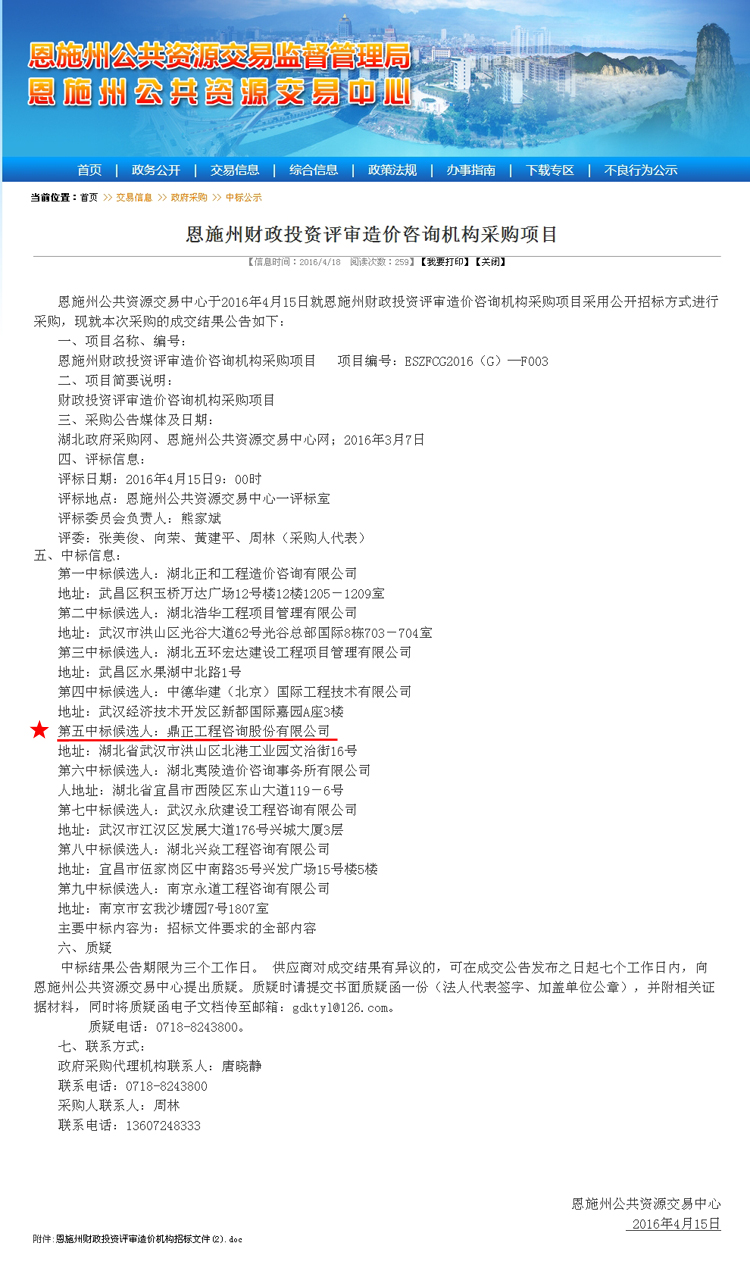 【經(jīng)營成果】我司中標(biāo)恩施州財政投資評審造價咨詢機(jī)構(gòu)采購項目