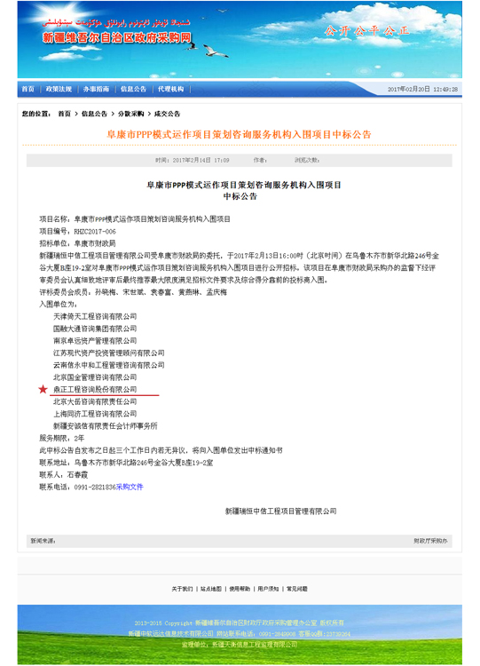 近日,新疆維吾爾自治區(qū)采購網公布了阜康市PPP模式運作項目策劃咨詢服務機構入圍項目中標公告,我司成功入圍。