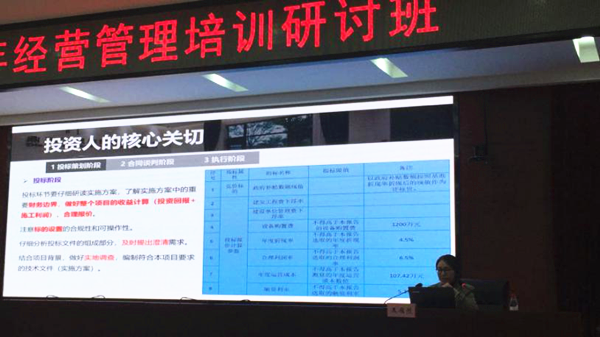 王雁然董事長從“PPP的發(fā)展趨勢”、“PPP概述”、“PPP政策”和“PPP全生命周期實務操作”四個方面進行了全面系統(tǒng)的講解,PPP高級項目經(jīng)理王海蓮結合《京山市武荊高速公路連接線七寶山部分礦山地質(zhì)環(huán)境恢復治理工程PPP項目》(以下簡稱“七寶山PPP項目”)案例分享了投資人的核心關切與解決方案。七寶山PPP項目是地礦系統(tǒng)參與的第一個PPP項目,也是湖北省首個礦山地質(zhì)環(huán)境恢復治理工程采用PPP模式實施的項目。王海蓮經(jīng)理分析了該項目從策劃到落地全過程的核心關切點,并對項目在執(zhí)行過程中可能會出現(xiàn)的風險點給出相應建議方案。