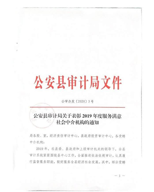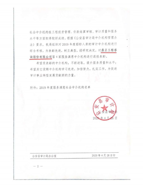 自2019年7月1日鼎正咨詢成為公安縣審計局的入庫合作單位以來,荊州分公司同事們在工程竣工結(jié)算審計過程中,精心組織、合理安排、嚴(yán)于律己、廉潔從審,在確保重點工程順利推進(jìn)、節(jié)約政府資金、提高投資效益等方面做出了突出貢獻(xiàn),得到了公安縣相關(guān)單位的一致好評,為公司贏得了信譽。